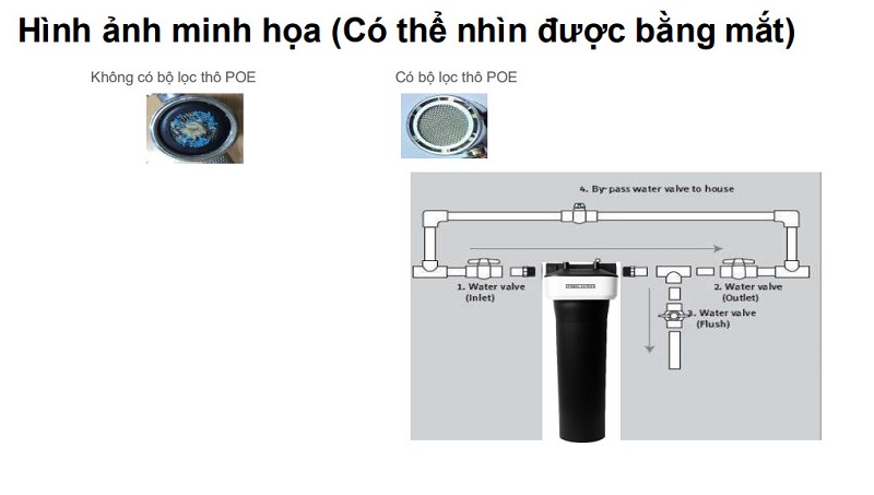 | Chất lượng nước sau lọc: | Loại bỏ mùi, các hạt như cát, đất, và rong rêu,... hạn chế cặn vôi |