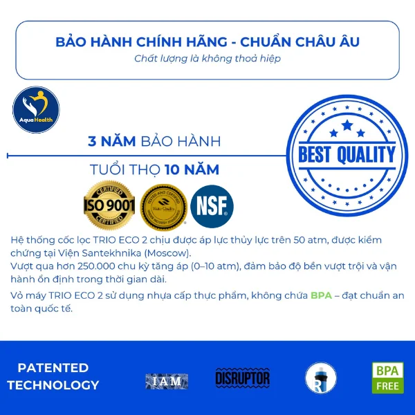 Để khẳng định sự an toàn và chất lượng vượt trội, lõi lọc nước Trio Eco 2 đã được kiểm định và cấp các chứng nhận chất lượng từ các tổ chức uy tín trong và ngoài nước. Các chứng nhận này không chỉ là bằng chứng về khả năng lọc hiệu quả mà còn là sự đảm bảo về việc sản phẩm tuân thủ các tiêu chuẩn nghiêm ngặt về sức khỏe cộng đồng. Việc sở hữu các chứng nhận quốc tế như chứng nhận từ Tổ chức Sức khỏe và Vệ sinh Quốc tế (NSF) hoặc các chứng nhận tương đương của châu Âu và Mỹ, là một minh chứng rõ ràng cho việc lõi lọc này có thể loại bỏ các chất gây ô nhiễm một cách hiệu quả, từ vi khuẩn, virus, kim loại nặng, đến các chất hóa học độc hại. Do đó, khi lựa chọn lõi lọc nước Trio Eco 2 để thay thế, bạn có thể hoàn toàn yên tâm về chất lượng nguồn nước và sự an toàn tuyệt đối cho sức khỏe của cả gia đình.