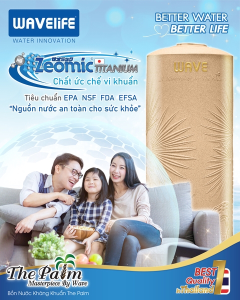 Bồn nước kháng khuẩn Wavelife là sản phẩm đầu tiên và duy nhất trên thị trường áp dụng thành công Công nghệ kháng khuẩn Silver Zeolite Titanium tiên tiến hàng đầu thế giới, có khả năng kháng khuẩn ở tất cả các điểm tiếp xúc với nước. Nghiên cứu từ phòng thí nghiệm cho thấy bồn có khả năng ức chế vi khuẩn lên đến 99.99%.