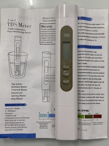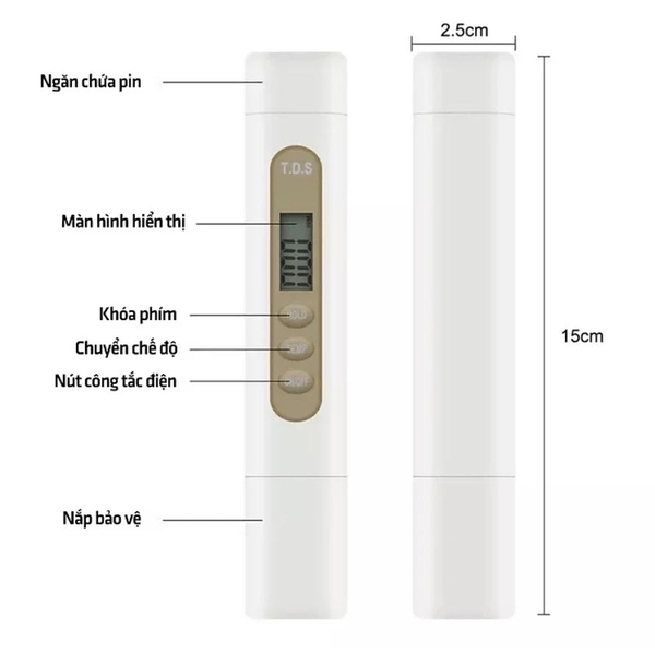 Bút kiểm tra TDS (Total Dissolved Solids - Tổng chất rắn hòa tan) là một dụng cụ nhỏ gọn, tiện lợi dùng để đo nồng độ các chất rắn hòa tan trong nước. Các chất này có thể bao gồm các khoáng chất, muối, kim loại,... Nồng độ TDS cao thường cho thấy nước có nhiều tạp chất hơn, có thể ảnh hưởng đến chất lượng và mùi vị của nước.