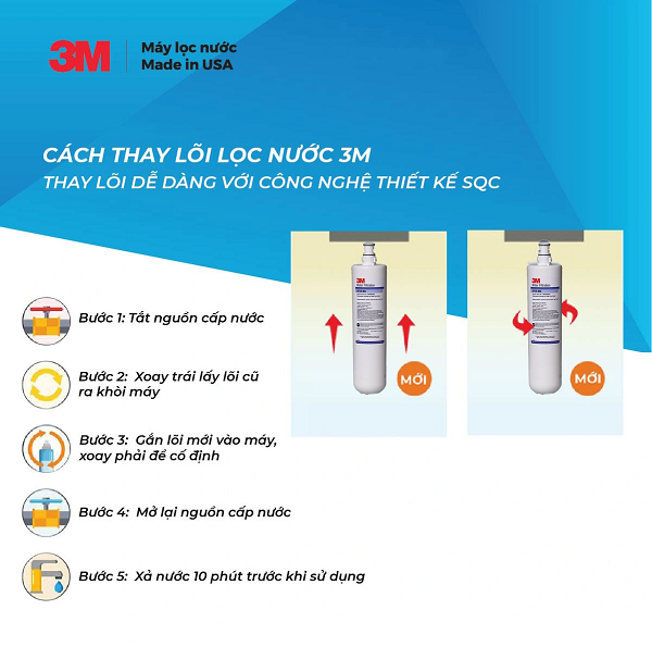 Lưu ý: Hãy xả nước ít nhất 10 phút sau khi thay lõi để đảm bảo chất lượng nước ổn định và đạt tiêu chuẩn tốt nhất.