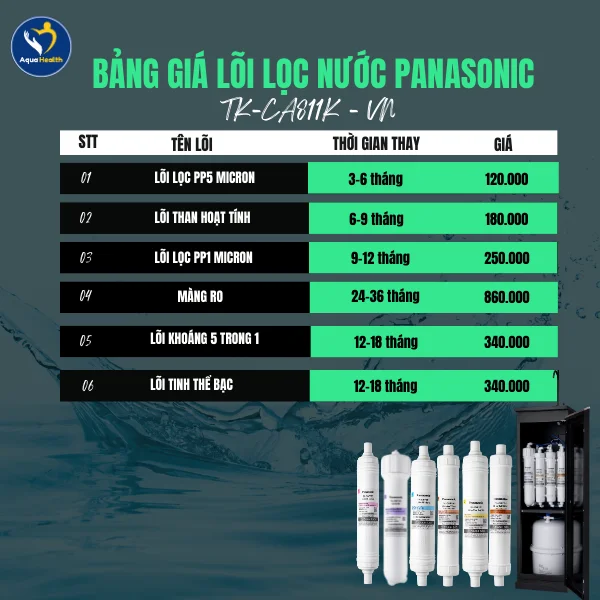 *Lưu ý: Giá Lõi Lọc Nước Panasonic trên chỉ mang tính chất tham khảo. Để biết chính xác Giá Lõi Lọc Nước Panasonic cho từng model máy cụ thể, bạn nên liên hệ trực tiếp với AquaHealth, chúng tôi còn có nhiều chương trình khuyến mãi và dịch vụ bảo trì chuyên nghiệp.