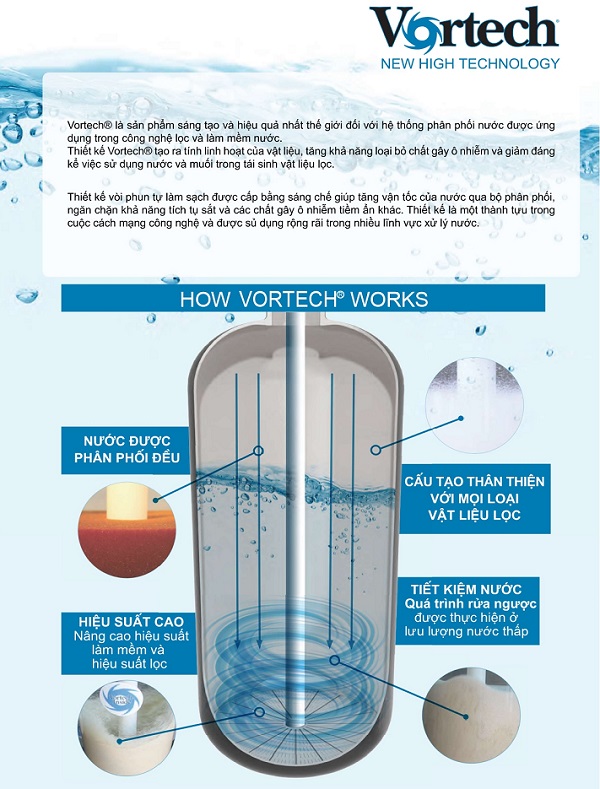 Vortech® là sản phẩm sáng tạo và hiệu quả nhất toàn cầu trong lĩnh vực lọc và làm mềm nước. Thiết kế của Vortech® mang lại tính linh hoạt cho vật liệu, tăng cường khả năng loại bỏ chất ô nhiễm và giảm đáng kể lượng nước và muối cần thiết cho việc tái sinh vật liệu lọc.