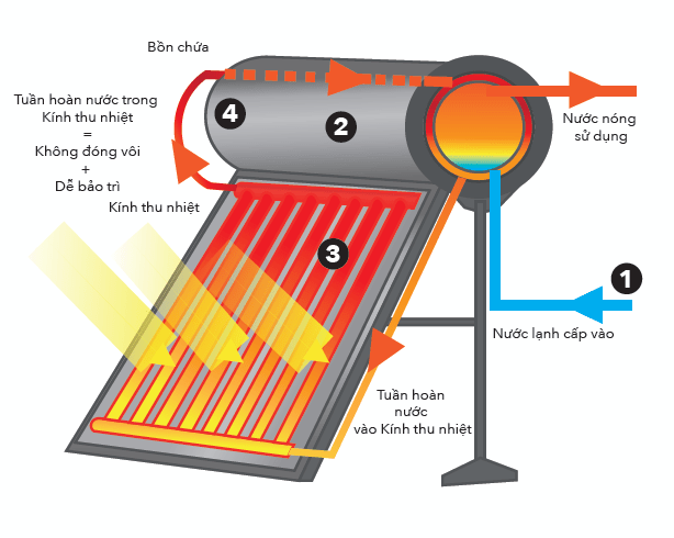Hệ thống hoạt động dựa vào trọng lực và đối lưu tự nhiên, cho phép nước di chuyển mà không cần bơm. Khi nước được làm nóng từ kính thu nhiệt, nước nóng sẽ tự động nổi lên trên và chảy vào bồn chứa. Lúc này, quá trình tuần hoàn nhiệt sẽ đưa nước lạnh dưới bồn xuống dưới các tấm kính thu nhiệt, tiếp tục chu kỳ này cho đến khi không còn ánh sáng mặt trời.