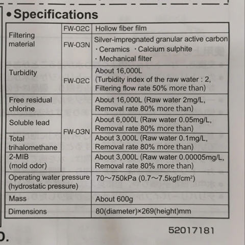 Công suất lọc của FW-01CN là 16.000 lít (dành cho khả năng xử lý clo dư).