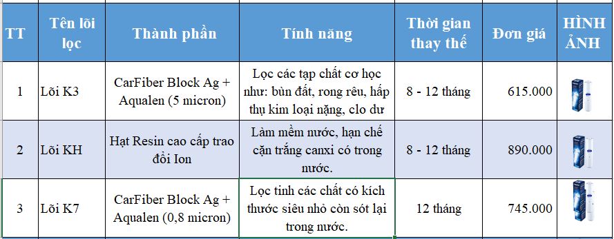| Thời gian dự kiến thay lõi lọc nước | Khoảng 12 tháng |