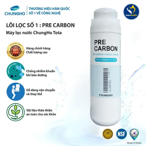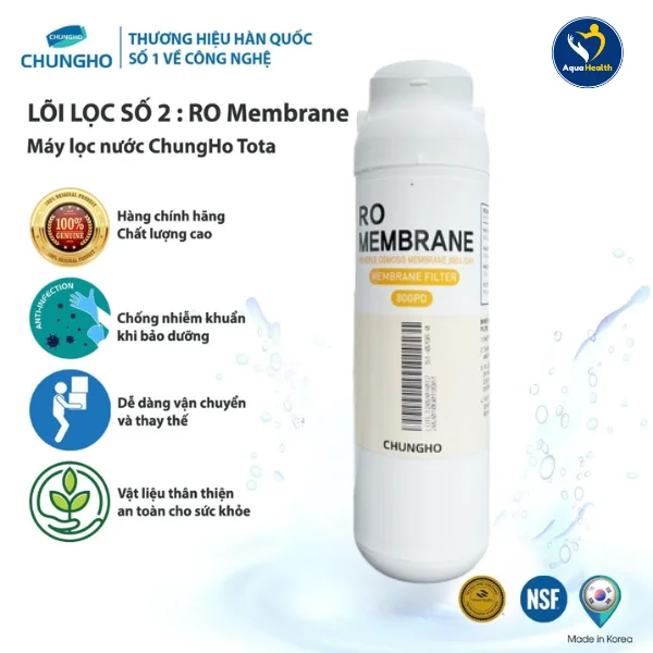 tổng chất rắn hòa tan (TDS) và các chất ô nhiễm. Ngoài ra, sản phẩm còn đạt tiêu chuẩn FDA của Cục Quản lý Thực phẩm và Dược phẩm Hoa Kỳ và chứng nhận KC (Korea Certification) của Hàn Quốc. Những chứng nhận này không chỉ đảm bảo nước đầu ra an toàn, mà còn khẳng định lõi lọc nước ChungHo Tota chính hãng đạt tiêu chuẩn nghiêm ngặt về vật liệu, không giải phóng hóa chất độc hại vào nước trong quá trình lọc.Các chứng nhận về chất lượng sức khỏe