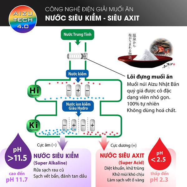 | 7 | Kiềm mức 4 | pH ~ 9.8 | Nước chuyên dụng nấu ăn siêu hydro, chiết xuất dinh dưỡng và mùi vị tốt hơn giúp cho món ăn vừa ngon vừa bổ |