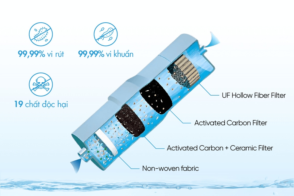 Cho nguồn nước sau lọc an toàn, diệt khoảng 99,99% vi khuẩn gây hại, đạt chuẩn an toàn đường tiêu hoá do bộ Y tế Nhật Bản cấp phép. Ngoài ra, lõi lọc sở hữu công suất lọc " khủng " lên đến 6000 lít nước. Tương đương trên 1 năm thời gian sử dụng gia đình từ 4-5 người.