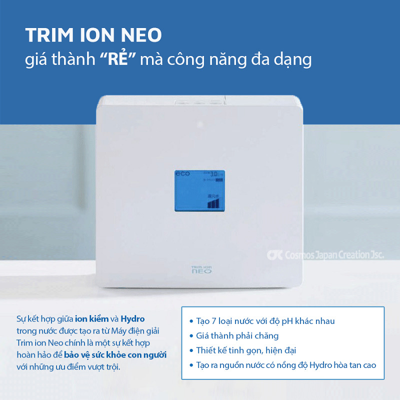 Nhờ 2 buồn điện phân, nồng độ Hydrogen của Trim Ion đạt 1300 (ppb). Cao nhất so với các máy điện giải có cùng số tấm điện cực. Chỉ số ORP (chống oxi hoá) lên tới -1500mV. Chỉ số này khẳng định tác dụng vô cùng hiệu quả trong việc làm chậm quá trình lão hóa, làm đẹp da và ngăn ngừa nhiều loại bệnh, trong đó có các bệnh về tế bào như ung thư.