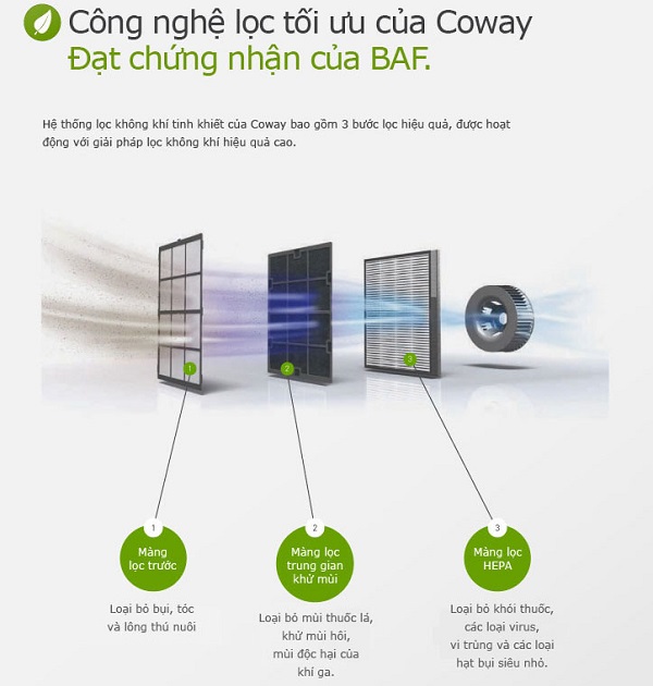 Máy lọc không khí Coway AIRES 10 (AP-1009CH) được trang bị hệ thống lọc với ba màng lọc hiện đại: màng lọc trước, màng lọc khử mùi và màng lọc HEPA. Máy có khả năng loại bỏ tới 99,9% bụi bẩn, nấm mốc, vi khuẩn, lông thú nuôi, cùng với các mùi khó chịu và độc hại. Sản phẩm này sẽ đảm bảo mang lại cho bạn và những người xung quanh bầu không khí trong lành và sạch sẽ suốt cả ngày lẫn đêm. Sở hữu chiếc máy lọc không khí này, bạn sẽ có một không gian sạch khuẩn, an toàn cho sức khỏe.