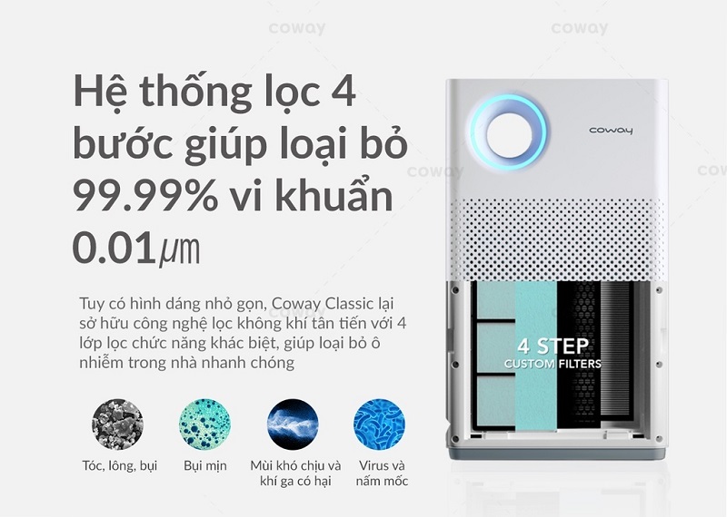 Coway CLASSIC (AP-1018F) được trang bị hệ thống lọc với 4 màng lọc tiên tiến, bao gồm màng lọc trước, màng lọc bụi mịn, màng lọc khử mùi và màng lọc HEPA. Sản phẩm có khả năng loại bỏ đến 99,9% bụi bẩn, nấm mốc, vi khuẩn, lông thú nuôi, và các mùi khó chịu, độc hại, đảm bảo bầu không khí trong lành cho không gian sống của bạn.