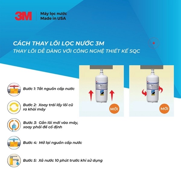 Máy lọc nước 3M ICE140-S được trang bị công nghệ tháo lắp nhanh SQC (Sanitary Quick Change), giúp khách hàng dễ dàng tự thay lõi lọc. SQC là công nghệ cho phép tháo lắp bộ lọc nước của 3M một cách nhanh chóng và thuận tiện. Chỉ với một động tác xoay 1/4 lõi lọc, bạn chỉ cần 10 đến 20 giây để hoàn tất quá trình tháo lắp mà không cần sử dụng bất kỳ dụng cụ kỹ thuật nào.