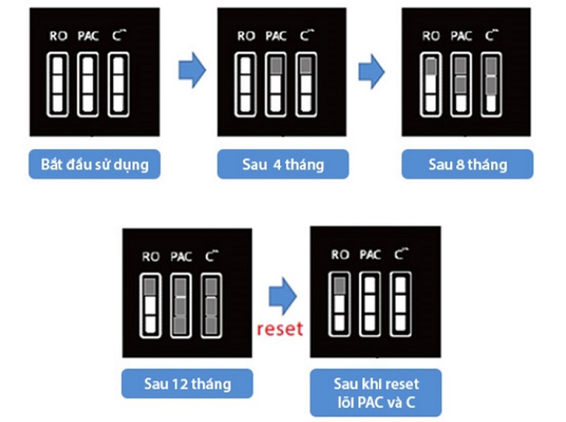 Tuổi thọ lõi lọc sẽ giảm dần theo mức hiển thị