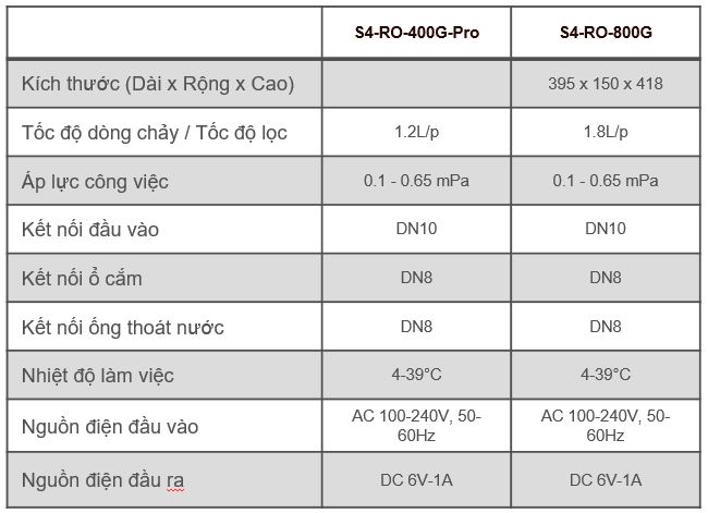 Thông số kỹ thuật máy lọc nước Vitopure S4-RO-400G Pro và S4-RO-800G