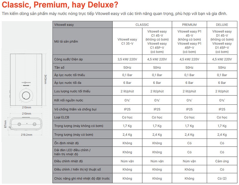 So sánh máy nước nóng gián tiếp Vitowell comfort Classic, Premium và Deluxe