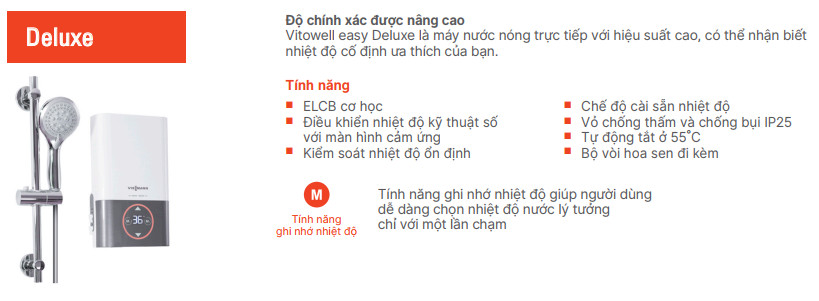 Máy Nước Nóng Trực Tiếp Viessmann Vitowell easy Deluxe là máy nước nóng trực tiếp dùng điện, đáng tin cậy và an toàn. Cầu dao chống rò điện (ELCB) điện tử và lớp vỏ chống nước bằng vật liệu chất lượng cao đảm bảo an toàn tối đa. Dòng sản phẩm rất bền bỉ, tiết kiệm năng lượng, một sản phẩm uy tín, ứng dụng công nghệ tiên tiến của Đức.
