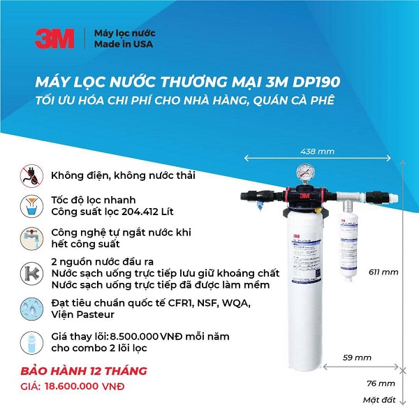 Máy Lọc Nước Thương Mại 3M DP190 đến từ thương hiệu nổi tiếng 3M tại Hoa Kỳ. Tập đoàn 3M được thành lập từ năm 1902, với trụ sở chính đặt tại Hoa Kỳ, và đã có hơn 100 năm kinh nghiệm trong nghiên cứu, phát triển và sáng tạo công nghệ mới. 3M hiện diện tại hơn 65 quốc gia, trong đó có 29 công ty quốc tế hoạt động sản xuất và 35 công ty có phòng thí nghiệm.