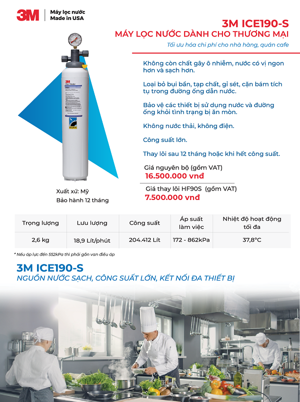 Máy lọc nước thương mại 3M ICE190-S là thiết bị lọc nước có công suất lớn, rất phù hợp cho quán cà phê, nhà hàng và bếp ăn. Với kích thước nhỏ gọn và thiết kế hiện đại, máy lọc này có tốc độ lọc nhanh, đáp ứng nhu cầu sử dụng nước cao của khách hàng. Công nghệ lọc IMPACT độc quyền từ Mỹ đã được 3M cải tiến để phù hợp hơn với người tiêu dùng tại Việt Nam.