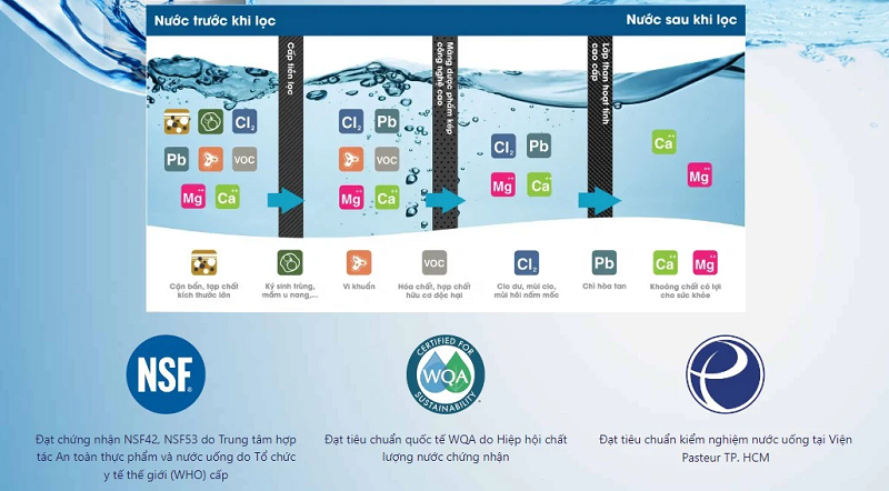 Sau khi nước được xử lý qua Thiết bị lọc nước thương mại 3M ICE190-S, nước sẽ được làm sạch khỏi vi khuẩn và các tạp chất có hại, cụ thể như sau: