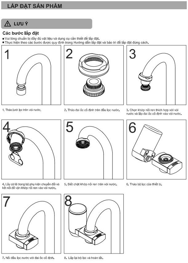 Quy trình lắp đặt máy lọc nước tại vòi Viessmann Vitopure S6-T khá đơn giản. Gồm 8 bước: